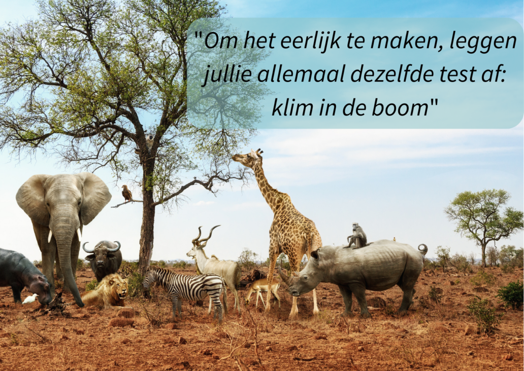Deze cartoon is al lang geen onbekende meer voor leerkrachten en andere onderwijsmensen. We zijn het er ook over eens dat een vis niet kunnen vragen om in een boom te klimmen. En toch is dat wat we blijven doen, want de andere leerlingen moeten dat ook doen, anders is het niet eerlijk.