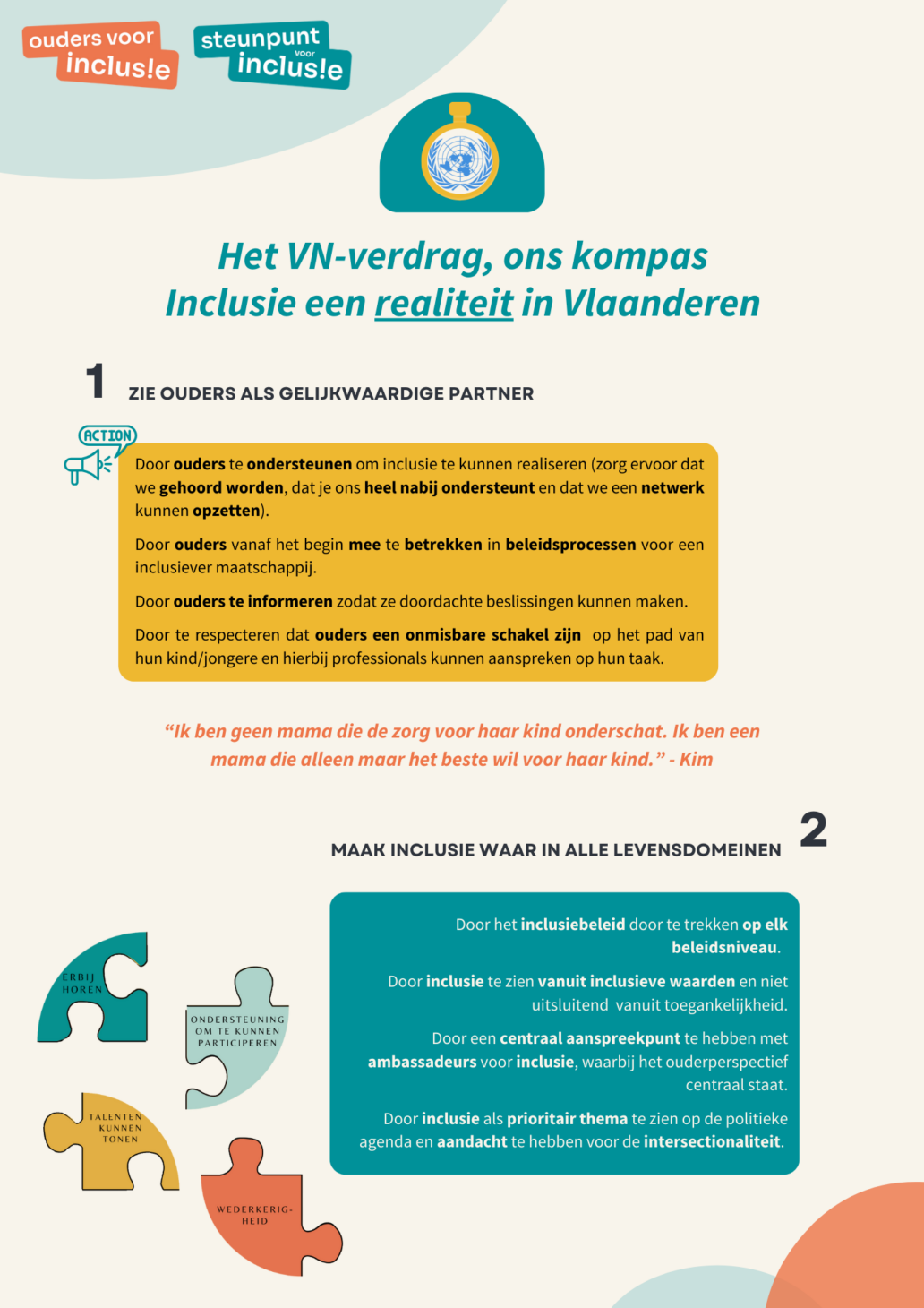 We hebben een nieuwe regering, een nieuwe start. Bij een nieuwe start horen ook nieuwe voornemens. Daarom bezorgen we u belangrijke aandachtspunten waarvan we hopen dat ze in uw nieuwe voornemens een plaats zullen krijgen. Want het is nu echt tijd voor ACTIE als het op Inclusie aankomt. We kennen inclusietrajecten die al 20 jaar lopen en nog steeds moeilijkheden ondervinden. Dit kan nu echt niet meer. Het is tijd om het VN-verdrag als kompas te hanteren binnen het beleid en toe te werken naar Inclusie. Het is ook tijd om ouders als volwaardige partners te zien en ons te ondersteunen in het pad dat we bewandelen met onze kinderen/jongeren.