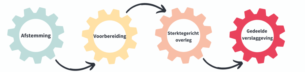 Inzetten op verbindend en sterktegericht overleg begint met een goede voorbereiding. Neem daarom vooraf voldoende tijd: Wat wil ik vertellen? Waar was ik verrast over? Waar maak ik me zorgen over? Waar wil ik afspraken of handvaten rond?